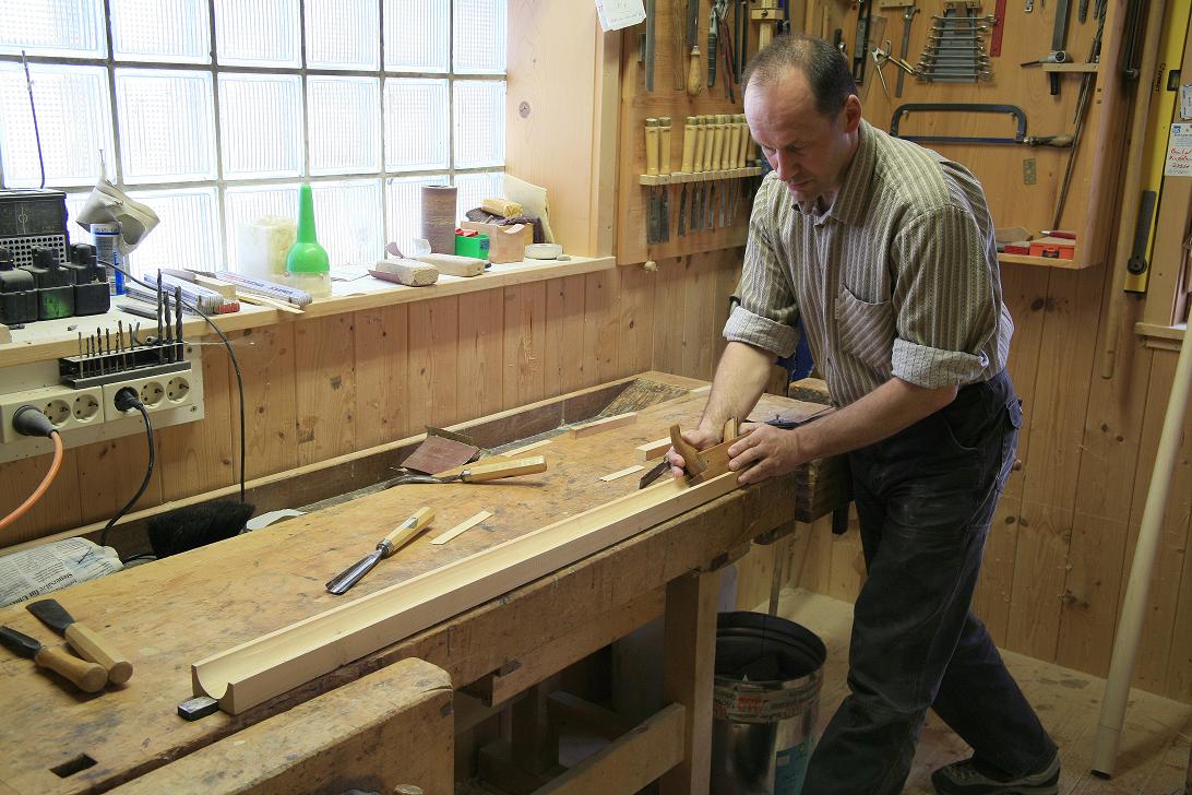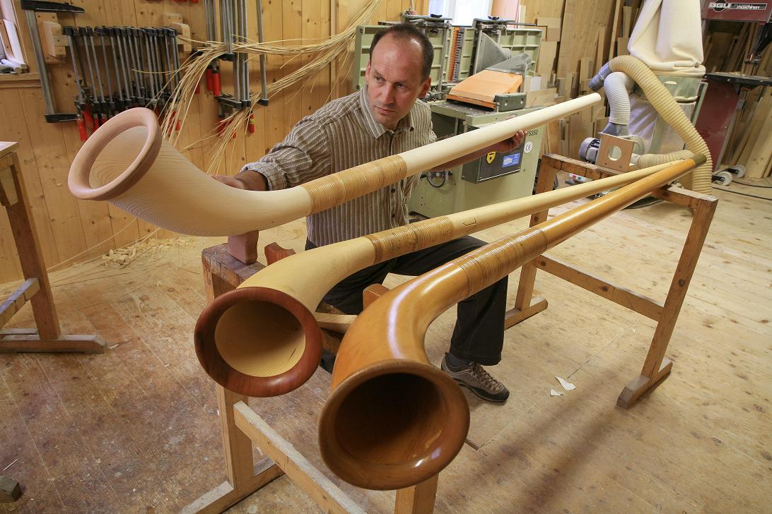 Die Tradition der Alphornbauer im Ostrachtal führt Stefan Wechs, Sohn von Herbert Wechs, in Hinterstein fort.